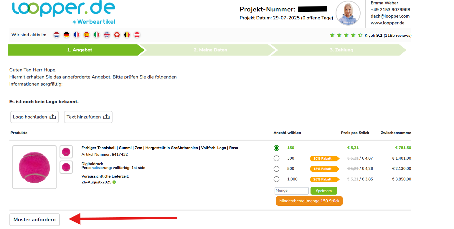 Du findest einen Button oder Link mit der Aufschrift „Muster anfordern“ in der Angebotsübersicht.