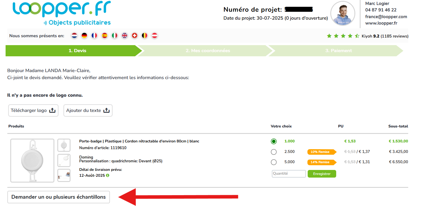 Vous verrez un bouton ou un lien intitulé “Demander un échantillon” dans l’aperçu de votre offre.