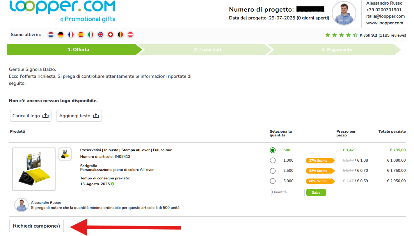 Vedrai un pulsante o un link con l’etichetta “Richiedi un campione” nel riepilogo della tua offerta.